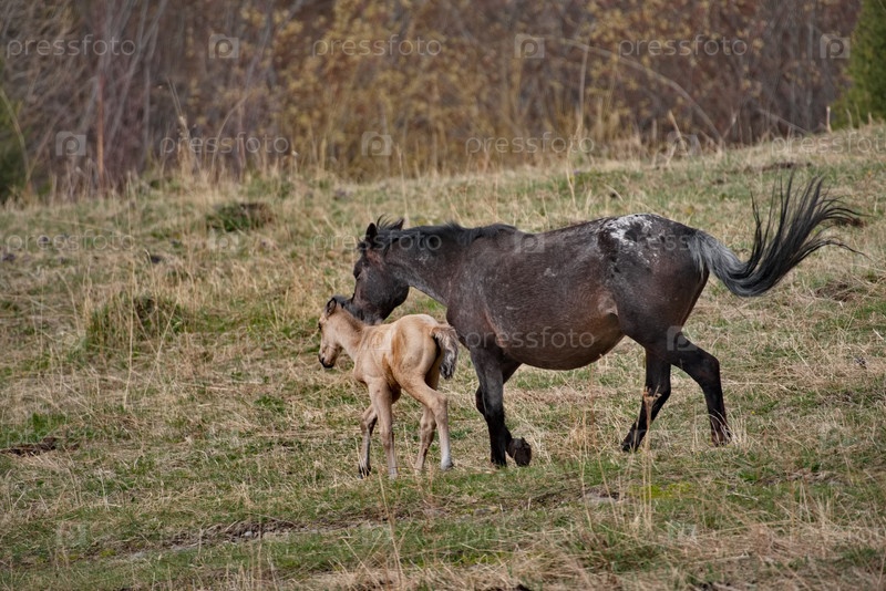 Россия. горы Алтай. мирно пасущие лошади с жеребцами в осенних горных степях вдоль Чуйского тракта