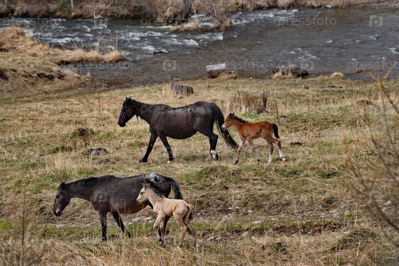 Россия. горы Алтай. мирно пасущие лошади с жеребцами в осенних горных степях вдоль Чуйского тракта