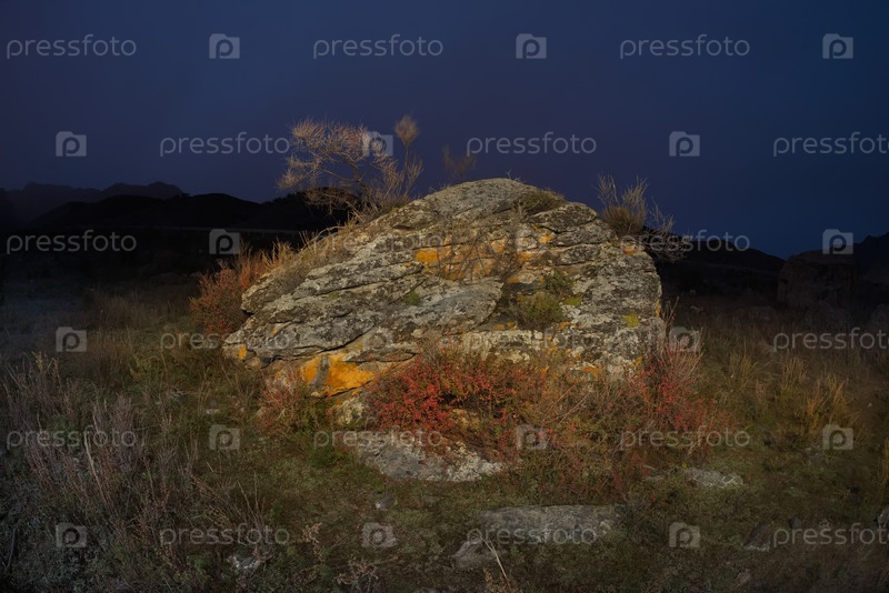 Юг Западной Сибири, Алтайские горы.Осенняя лунная ночь в каменной долине горной реки Катун недалеко от деревни Иния