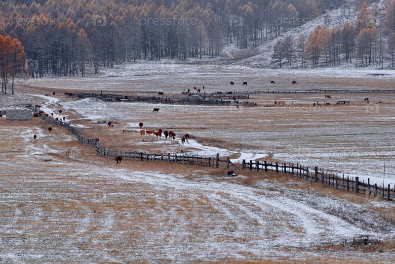 Юг Западной Сибири, горы Алтай.Небольшое стадо лошадей мирно пасется на снежном пастбище у подножия и в долине реки Кан