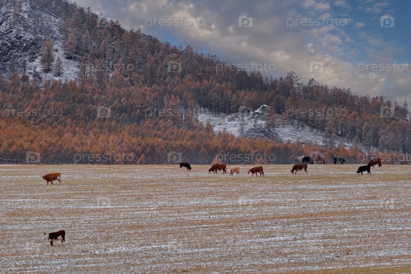 Юг Западной Сибири, горы Алтай.Небольшое стадо лошадей мирно пасется на снежном пастбище у подножия и в долине реки Кан