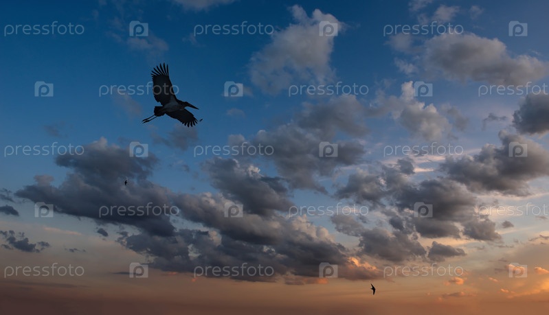 Восточная Индия. штат Ассам. завораживающий полет аисты-марабу на фоне закатенного неба в Национальном парке Казиранга