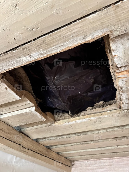 Открытие в потолке старого дома для дымохода на отопительной печи