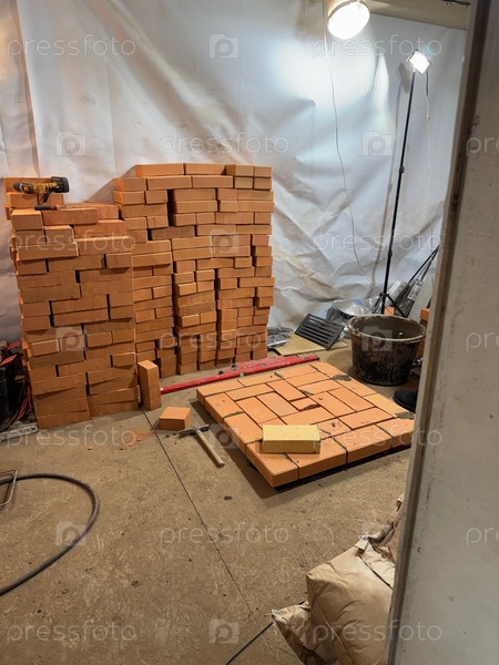 Основа плиты выполнена из кирпича. есть пакет кирпичей и инструментов. строительство новой отопительной печи