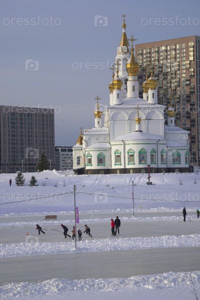 Зимний городской пейзаж снежного Екатеринбурга.Церковь Святого Бога Строителей, расположенная в Академическом районе города Екатеринбург