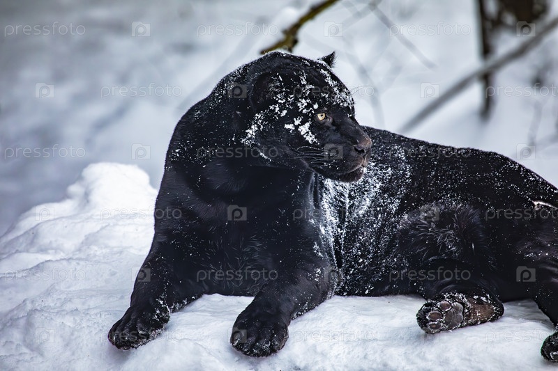 Черный ягуар в снежном лесу