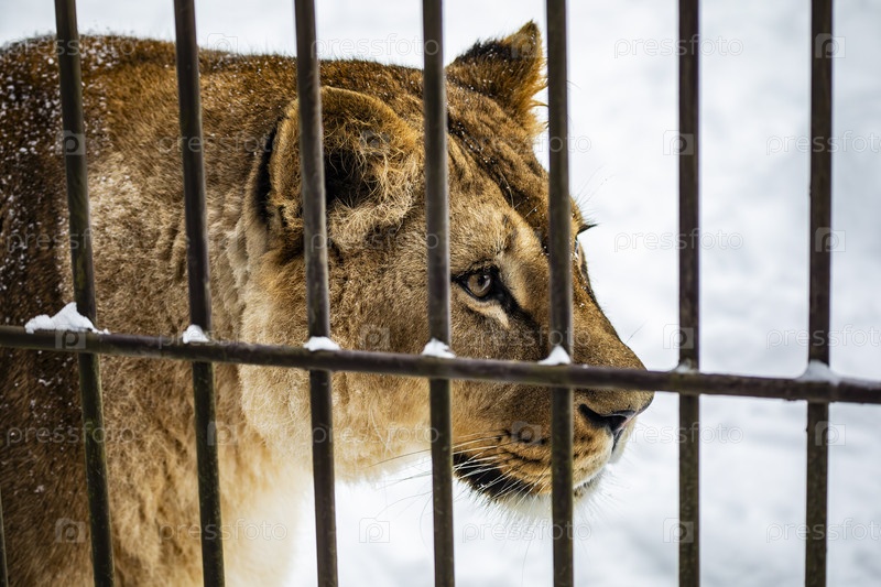Львица за решеткой в зимней клетке зоопарка