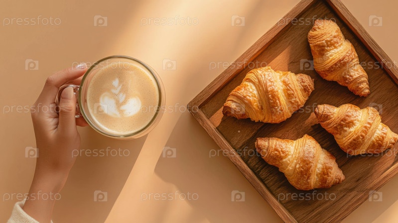 Уютная завтраковая квартира с круасантами и латте-арт захватывает теплую утреннюю атмосферу, культуру кафе, свежие хлебные изделия и моменты расслабляющего образа жизни