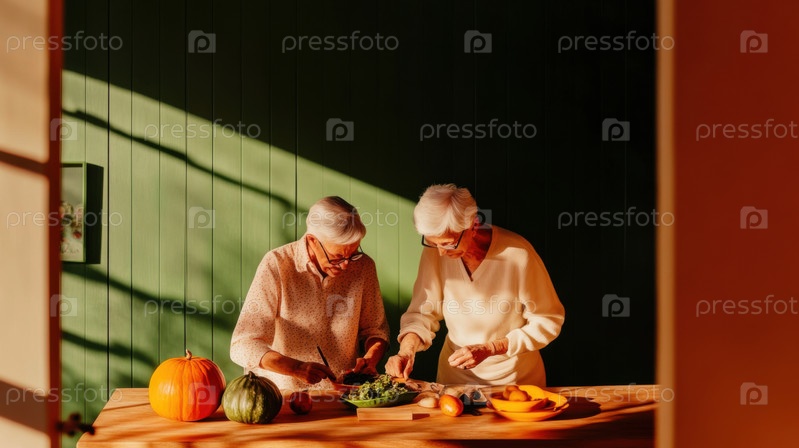 Пожилая пара готовит свежую растительную пищу на уютной солнечной кухне с тыквами и фруктами, празднуя здоровье, любовь и домашний образ жизни на пенсии