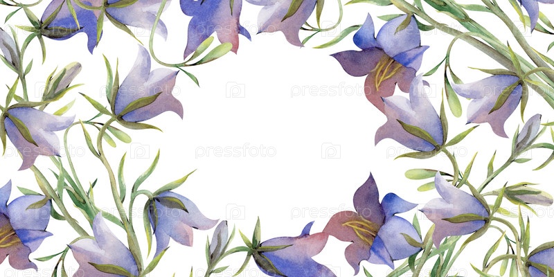 Горизонтальная рамка акварели с ручными рисунками голубых колокольных цветов, бутонов и зеленых листьев. Ботанический шаблон с дикими цветами на белом фоне и пустым местом для вставки. Для визитных карточек, открыток, приглашений