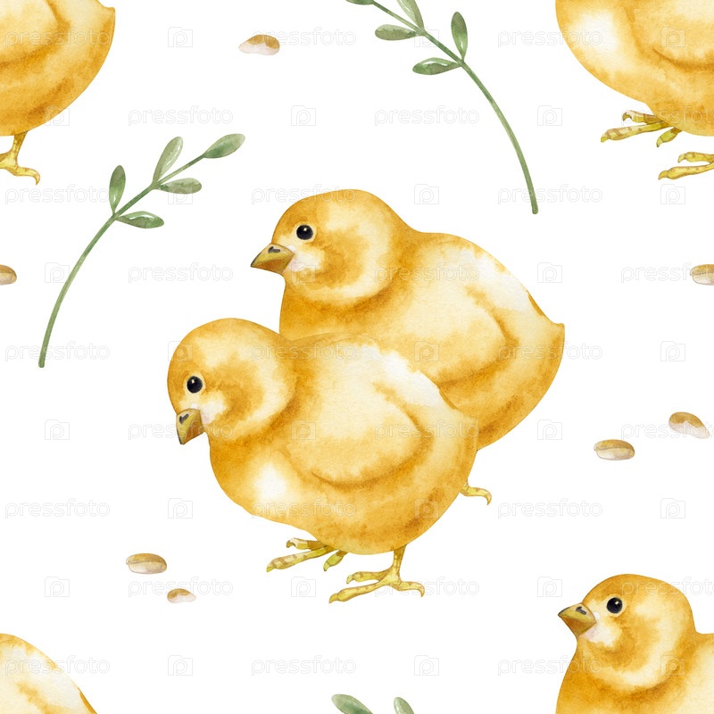 Акварельный бесшовный рисунок с желтыми курицами, зерном и зелеными ветвями на изолированном фоне. Фото птиц во дворе птицы в натуральных цветах. Бесшовный фон с реалистичными цыплятами для обоев детской комнаты, текстиля, отделки ag