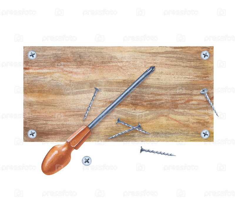 Композиция с помощью отвертки и множества винтов на коричневой деревянной доске. Иллюстрация акварели с рабочими инструментами на изолированном фоне. Реалистичный клипарт для ремонта и строительства