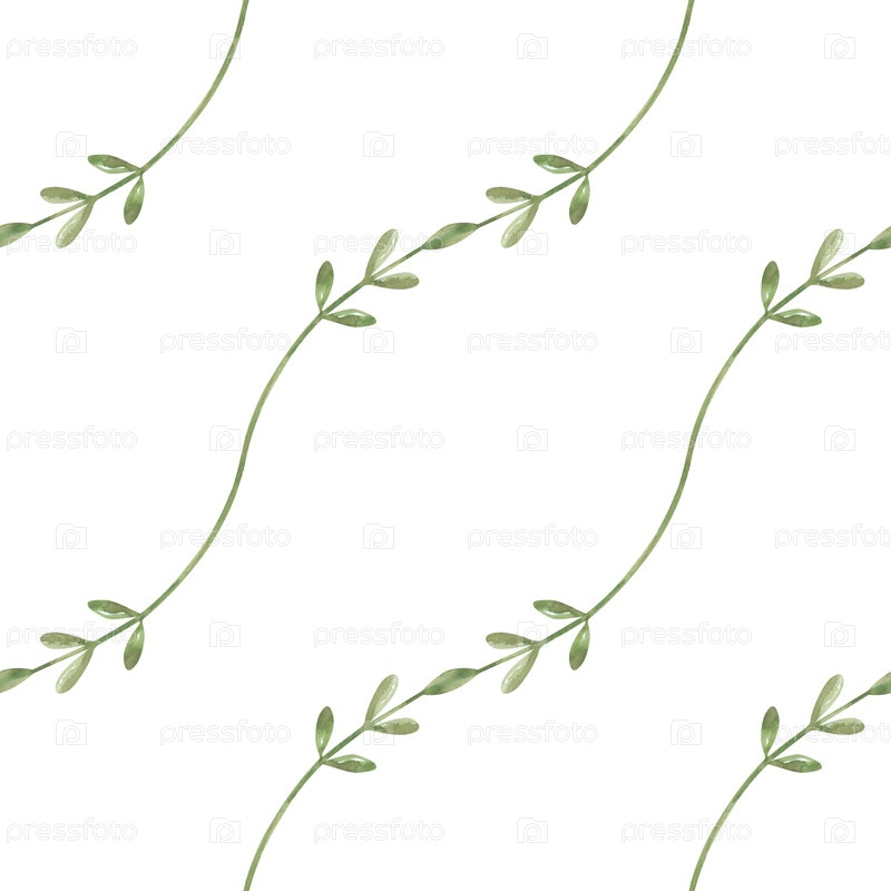 Диагональный бесшовный рисунок с тонкими зелеными ветвями на изолированном фоне. Ботанический орнамент с листьями свежих цветов. Минимальный бесшовный фон для обертывания бумаги, обоев, текстиля, посуды