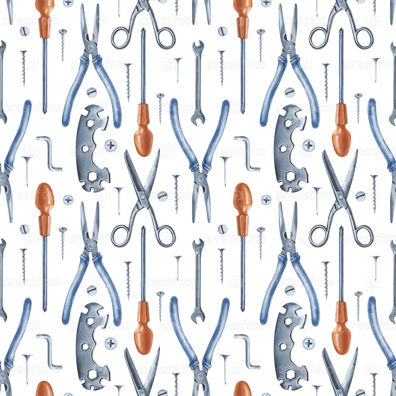 Бесшовный вертикальный рисунок с работающими мужскими инструментами на изолированном фоне. Иллюстрация акварелей с реалистичными железными инструментами для ремонта дома. Для регистрации строительного и ремонтного бизнеса