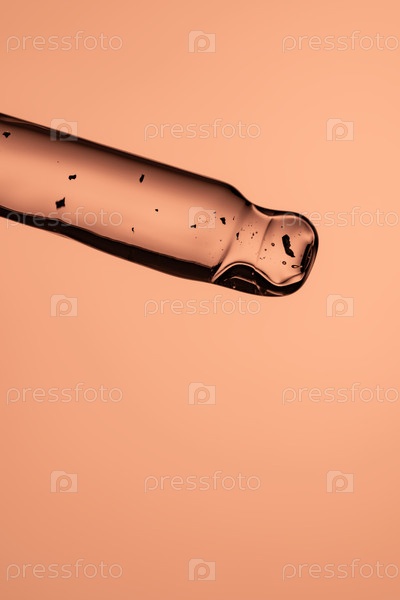 Близкий снимок стеклянной косметической пипетки с одной каплей желтого эфирного масла, сыворотки для лица или жидкого геля на ярко-оранжевом фоне