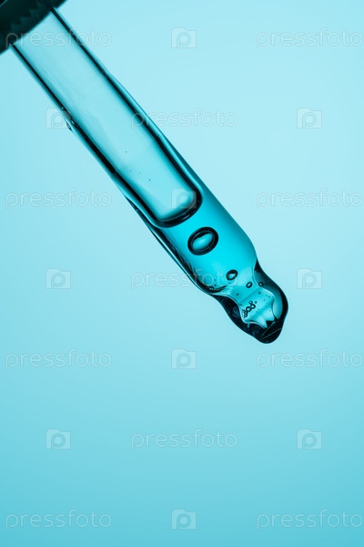Прозрачная стеклянная капля, заполненная голубым жидким гелем или сывороткой молока, с внутренними пузырями воздуха и каплей на кончике на соответствующем фоне.Фокусируйтесь на уходе за кожей, науке и гидратации