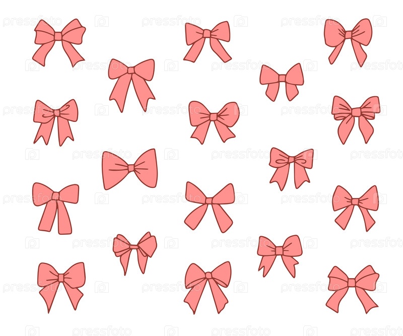 Набор ярких луков на белом фоне, подарковые ленты. Модный аксессуар для ткачества волос. Лента Dudlow. Ручно нарисованный вектор