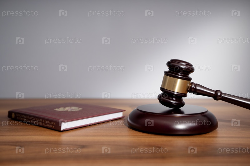 Деревянный молоток судьи и книга конституции в кабинете