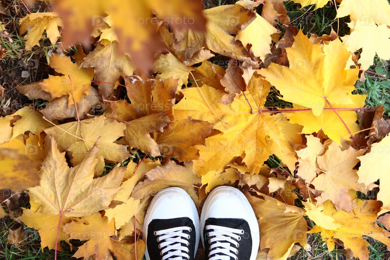 Осенние листья. Ноги в кроссовках на осенних листах. Вид сверху. Доистория осенних изданий