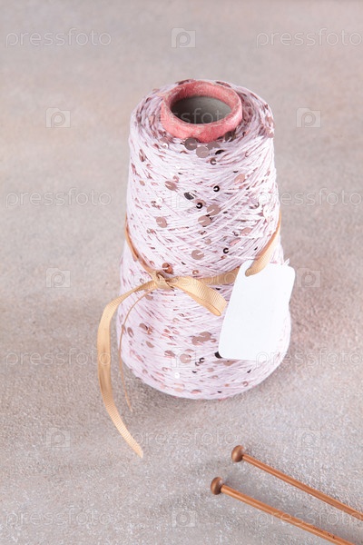 Элегантная пряжа для вязания с лакомствами. Игла на барабане. Концепция хобби и ремесел. Легкая запорка со лакомством. Элегантное блестящее блинчики. Бамбуковые трикотажные иглы