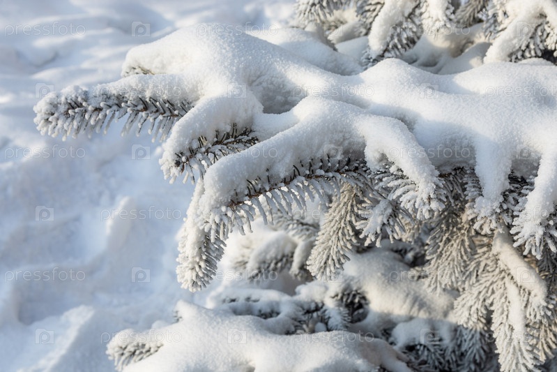 ветвь елей, покрытая морозом и снегом в морозный день. свет и тень. холодно