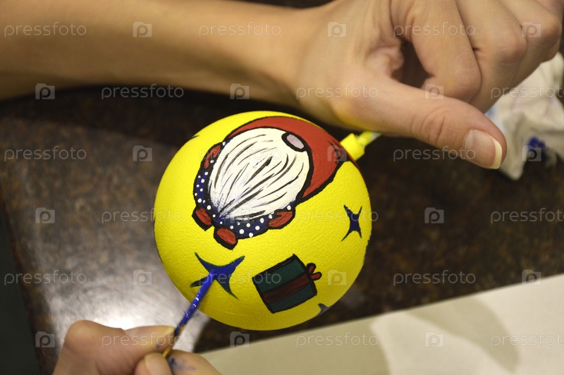 Женские руки тщательно рисуют ярко окрашенный рождественский шар: с помощью кисти на его поверхности нарисован силуэт карлика с полной бородой