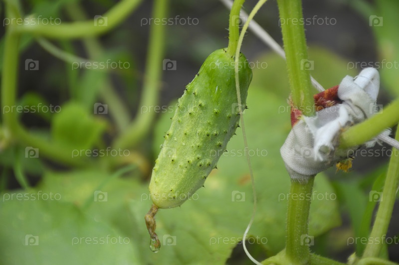 На ветке куста висит маленький зеленый огурец с цветом в конце. выращивание органических овощей на открытом поле и в теплице. вкусная, здоровая, обогащенная и освежающая пища