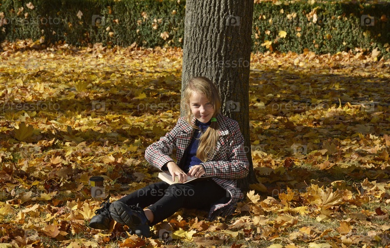Красивая девушка сидит, опираясь на ствол дерева на упавших листьях с книгой и чашечкой кофе или чая в осеннем парке