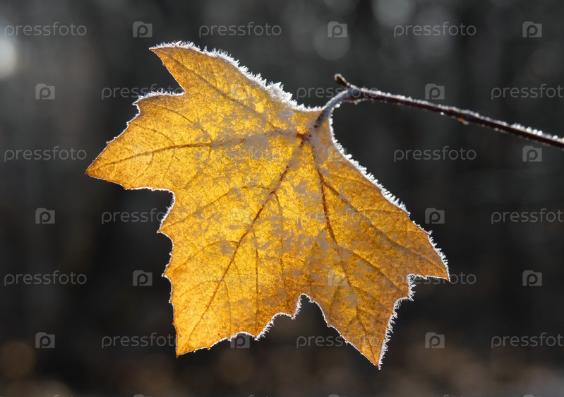 Замороженный осенний лист на тёмном лесном фоне