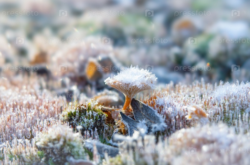 Нежные кристаллы мороза на крошечном грибе в моховом лесу