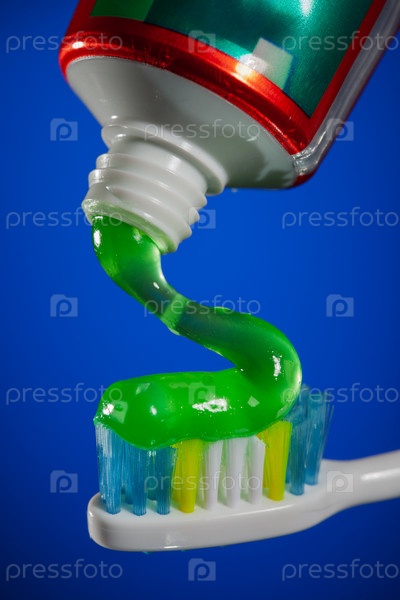 Зеленую гелевую зубную пасту выжимают из трубы на красочные щетины зубной щетки, концепцию стоматологической гигиены и ухода за полостью рта на ярко-синем фоне