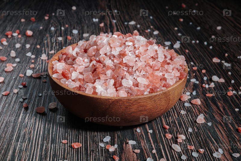 Деревянная миска, заполненная розовыми кристаллами гималайской соли на темном деревянном столе, натуральная минеральная приправа для здоровой кулинарии и спа-концепции