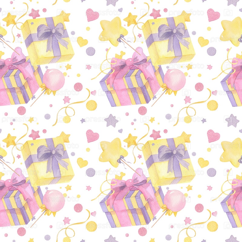 Бесшовный рисунок подарочных ящиков, цыпочек, конфетти и серпентина. Иллюстрация акварели ручной работы. Для упаковочной бумаги, поздравительных открыток, украшений и иллюстраций