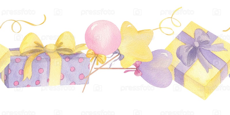 Бесшовная оболочка жёлто-фиолетовой подарочной коробки и леденец. Иллюстрация ручного акварелирования. Для упаковочной бумаги, поздравительных открыток, украшений и иллюстраций