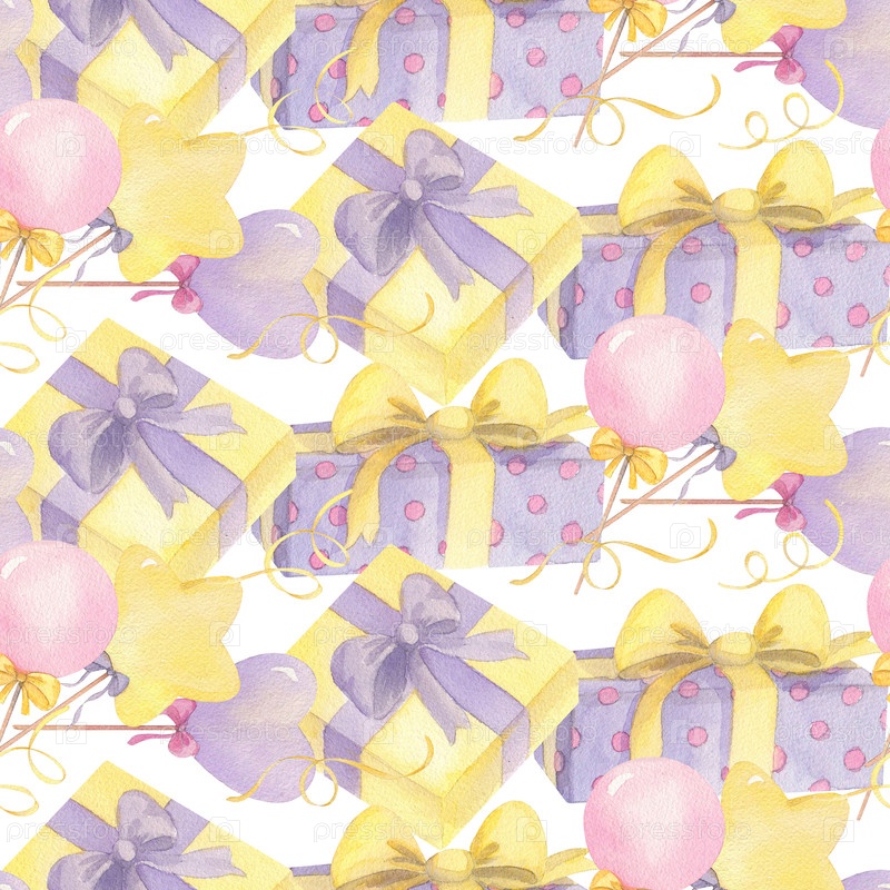 Бесшовный рисунок из жёлтых и фиолетовых подарочных коробок, серпентин и леденец. Иллюстрация ручной акварели. Для упаковочной бумаги, поздравительных открыток, украшений и иллюстраций