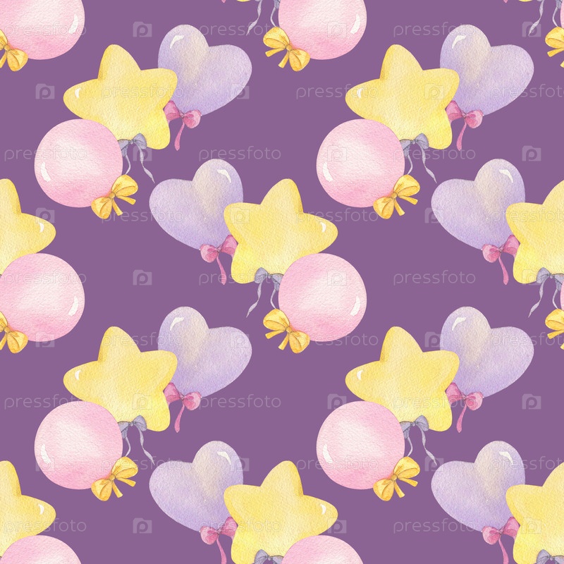 Бесшовный рисунок сердца, круглых и звездообразных объектов с луками на темно-фиолетовом фоне. для ткани, упаковочной бумаги, поздравительных открыток, дизайна, декора и иллюстрации