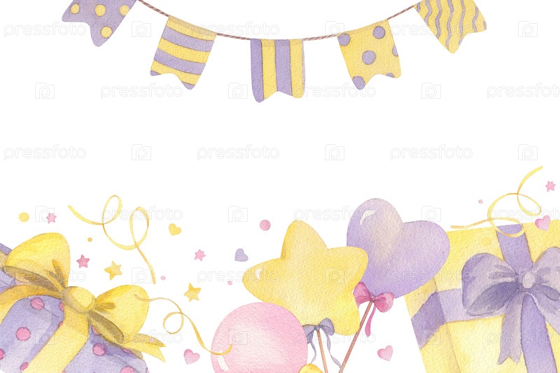 Рама торта на день рождения, гирлянда с флагом, серпентина, подарки, конфетти и леденецы. для упаковочной бумаги, поздравительных открыток, украшений и иллюстраций