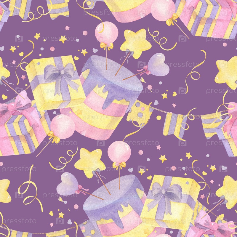 Бесшовный рисунок торта с лилочками, коробками для подарков, серпентинкой и конфетти на фиолетовом фоне.Для упаковочной бумаги, поздравительных открыток, украшений и иллюстраций