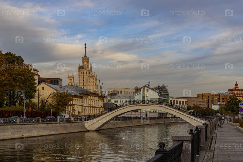 Живописный вид на канал с элегантным арочным мостом в Замоскворечье и исторической архитектурой