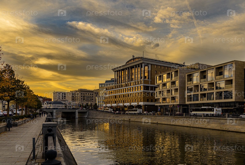 Живописный городской пейзаж в Замоскворечье на набережной во время заката с современной архитектурой