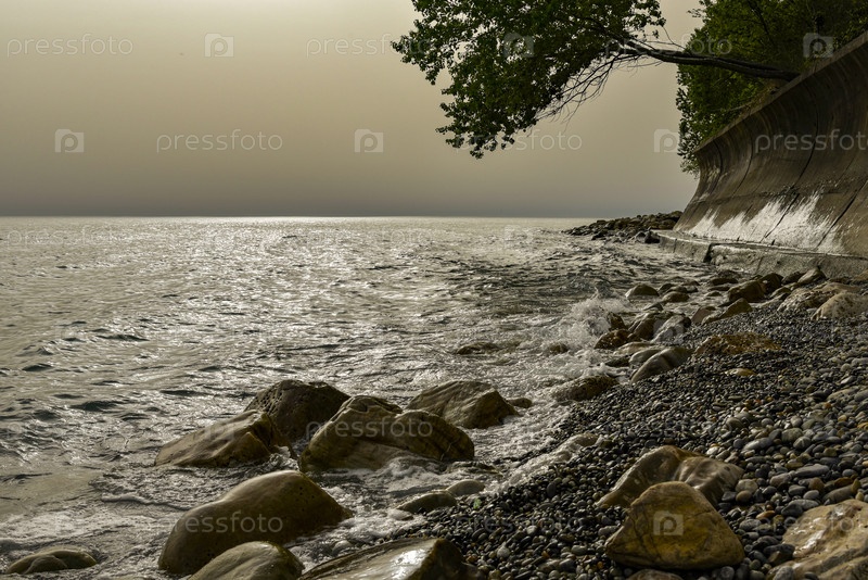 Спокойный вид на море с волнами, врезающимися в скалистый берег