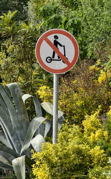 Скутеры запрещены - Предупредительный знак, окруженный пышной тропической зеленью