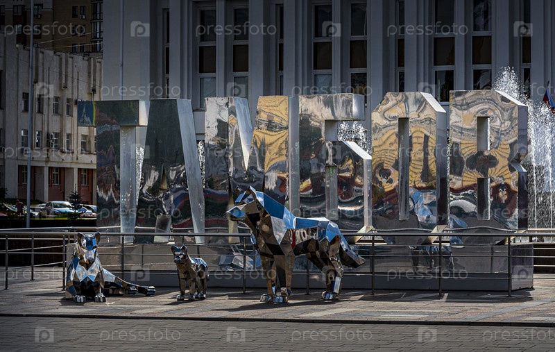 Зеркальные скульптуры тамбовских волков, зеркальное название города Тамбова и водные объекты в городской инсталляции