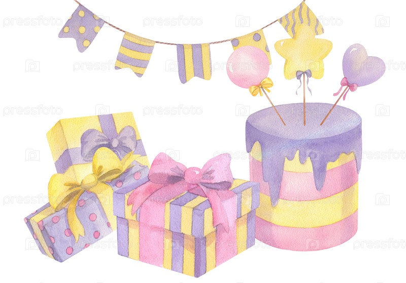Подарочная коробка из полосатых желтого и фиолетового цвета и шариков. Иллюстрация ручной акварели. Для упаковочной бумаги, поздравительных открыток, украшений и иллюстраций