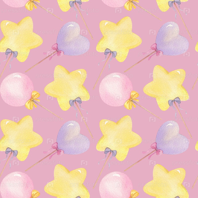 Композиция желтых, розовых и фиолетовых конфет. Ручная акварельная иллюстрация леденец. Для ткани, упаковочной бумаги, поздравительных открыток, дизайна, декора и иллюстрации
