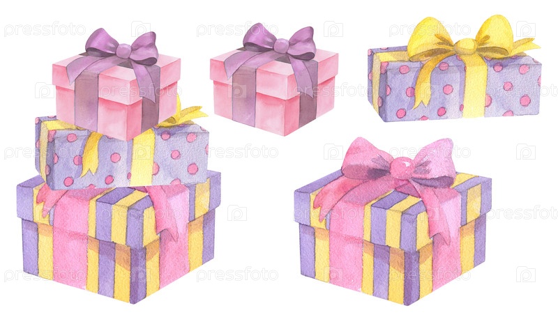 Пирамида подарков и их элементы. Ручная иллюстрация подарочной коробки. Для ткани, упаковочной бумаги, поздравительных открыток, дизайна, декора и иллюстрации