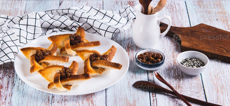 Формированный тост со клубничным вареньем на тарелке на столе веб-баннер