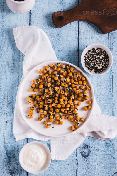 Апетит жареные горохи с кунжутными семенами и травами на верхней части тарелки и вертикальный вид