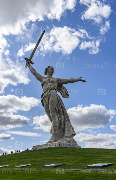 Монументальная статуя Родины с мечом в руках на фоне драматического неба