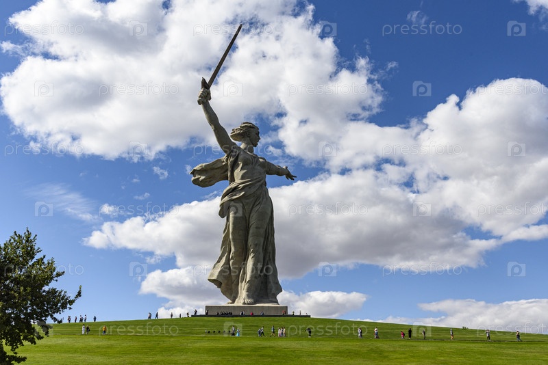 Монументальная статуя Родины с мечом в руках на фоне драматического неба